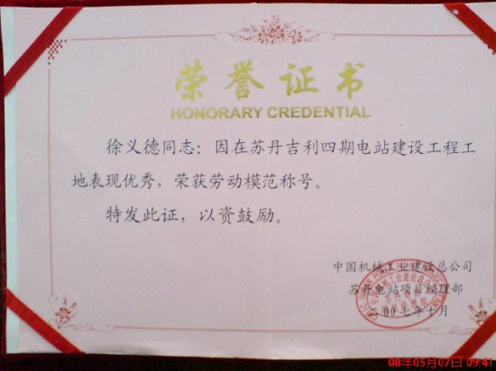 中昇建機(jī)工程師徐義德榮獲蘇丹吉利電廠四期工程2007年度勞動(dòng)模范稱號(hào)