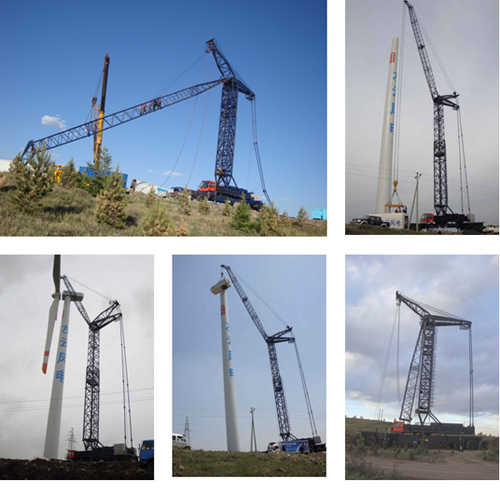 由我公司自主研發(fā)的第二臺風(fēng)電專用吊機於2009年5月交付現(xiàn)場使用,於山西左云風(fēng)電項目由天津電建公司克服了惡劣的路面環(huán)境順利完成現(xiàn)場吊裝任務(wù),第二臺風(fēng)電吊機起升高度可達90米,最大吊重可達80噸(15m處),可滿足1.5~2.0兆kw風(fēng)電機組吊裝要求。
