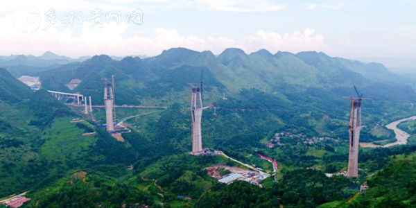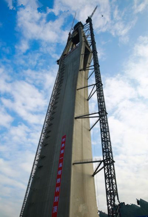 11月13日下午,2016年4月29日開工建設(shè)的平塘特大橋三座主塔已成功封頂,工程編號為16號的主塔塔高332米,為目前高混凝土同類型橋梁世界第一,較目前國內(nèi)最高塔蘇通大橋主塔(300.4m)高31.6米。