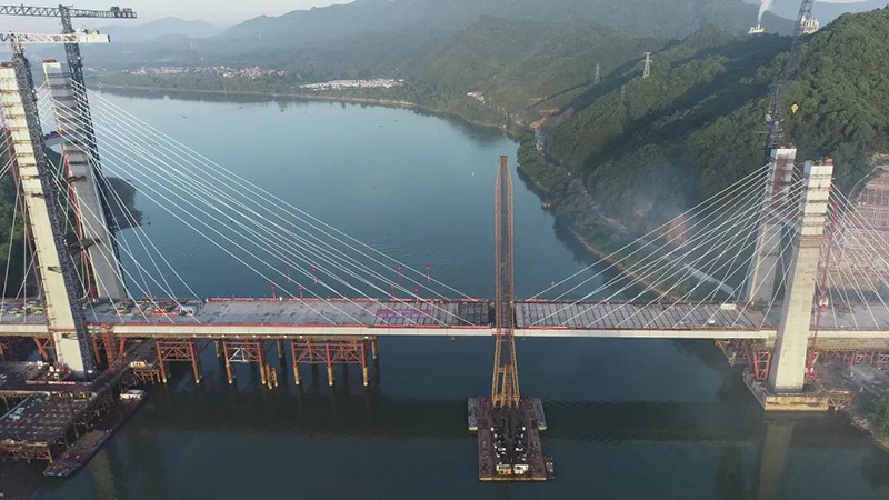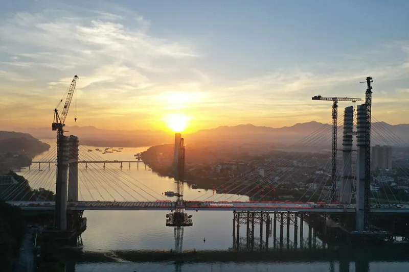 該工程采用由我公司生產(chǎn)研發(fā)的兩臺(tái)ZSC2200、一臺(tái)ZSL2700塔機(jī)完成吊裝任務(wù)。其中,富春江大橋?yàn)槿€控制性工程,為國(guó)內(nèi)首座設(shè)計(jì)時(shí)速350公里的4線無(wú)砟軌道高低塔斜拉橋,全長(zhǎng)535米,主跨300米,設(shè)計(jì)為混合梁斜拉橋,采用高、低塔非對(duì)稱(chēng)邊跨布置。主墩索塔設(shè)計(jì)均為“H型”橋塔,主梁采用鋼混組合結(jié)構(gòu)。