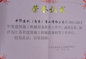 中昇建機(jī)被評為2011~2012年度江蘇省建筑施工機(jī)械設(shè)備租賃“十佳單位”