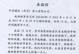 我公司在中建八局金陵飯店擴(kuò)建工程項(xiàng)目結(jié)束之際,以認(rèn)真負(fù)責(zé)的態(tài)度、高水平的施工質(zhì)量,圓滿完成塔機(jī)拆除工作,榮獲項(xiàng)目方的高度表揚(yáng)。 2012-06-26 |