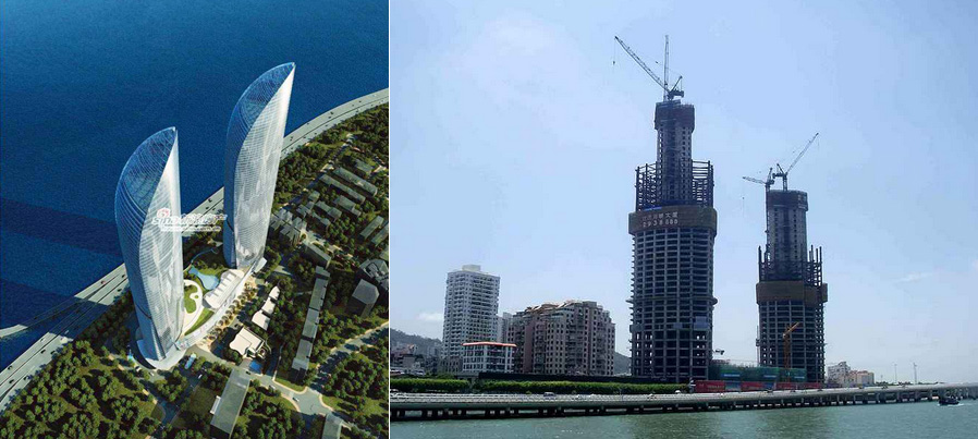 施工高度307米,采用中昇建機兩臺ZSL1250(最大吊重64t),一臺ZSL750(最大吊重50t)